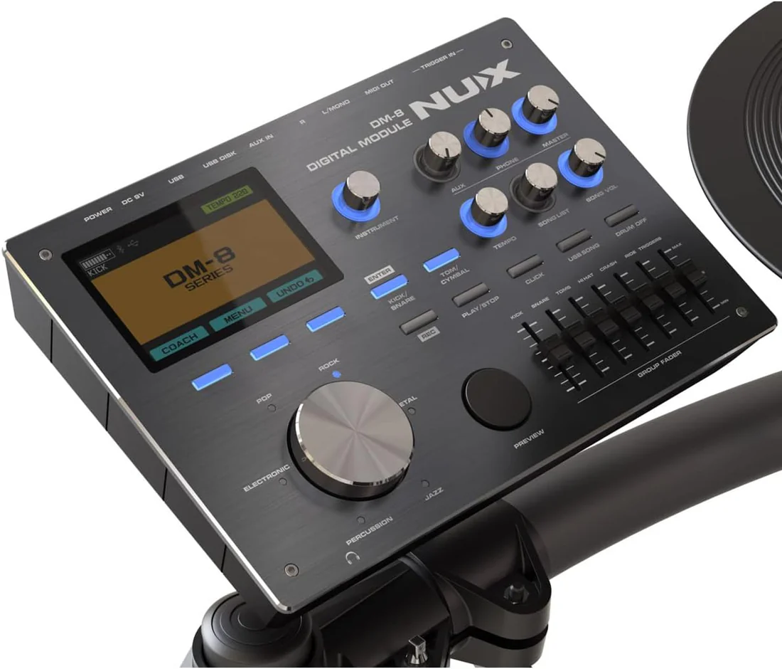 Batería Electrónica NUX DM-8 con increíble diseño que presenta nuevas tecnologías innovadoras, brindando a los bateristas una sensación acústica auténtica y una interpretación expresiva realista. Entre sus características mas relucientes se encuentra un sistema de Hi hat con atril real y un pad de redoblante de ultima tecnología y pads de malla manufacturados por REMO que realzan el realismo de la batería, así como otorgando un sonido profesionales lleno de herramientas digitales que facilitan los procesos de grabación, estudio y conciertos.