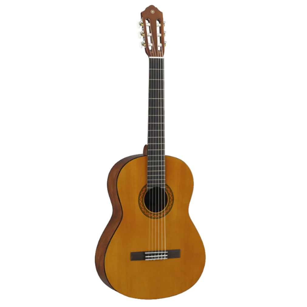 Yamaha C40 clásica tamaño 4/4: tapa de abeto, aros y fondo de meranti, mástil de nato, diapasón y puente de palo rosa, escala de 650 mm, cejuela de 52 mm, clavijas cromadas, cuerdas de nylon, acabado brillante. Sonido cálido ideal para principiantes. Peso: 4.5 kg aprox.