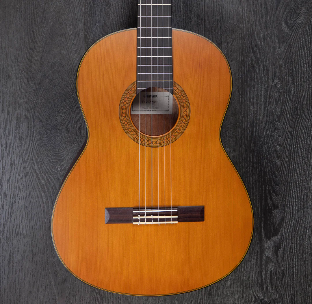 Yamaha CG122MC: tapa sólida de cedro (pícea Engelmann/Western Red Cedar), cuerpo, laterales y mástil de nato, diapasón y puente de rosewood/nogal, escala de 650 mm, cejuela de 52 mm, acabado mate. Cuerdas S10 incluidas. Proyección cálida ideal para estudiantes intermedios.