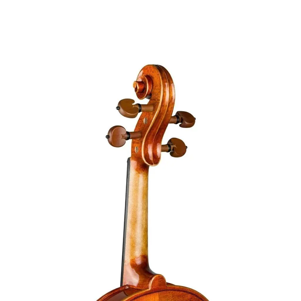 Violín ideal para estudiantes intermedios y avanzados, construido con maderas de alta calidad y acabados de lujo. Tapa frontal de pino abeto nevado seleccionado sólido, aros y fondo de arce flameado seleccionado sólido, clavijas y mentonera en boxwood, diapasón de ébano sólido.